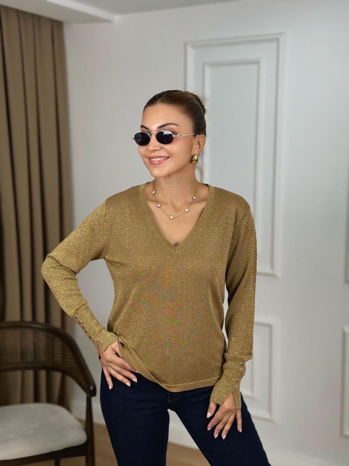 Haki V Yaka Kolları Düğmeli Simli Bluz 251123 (P-00000009150)