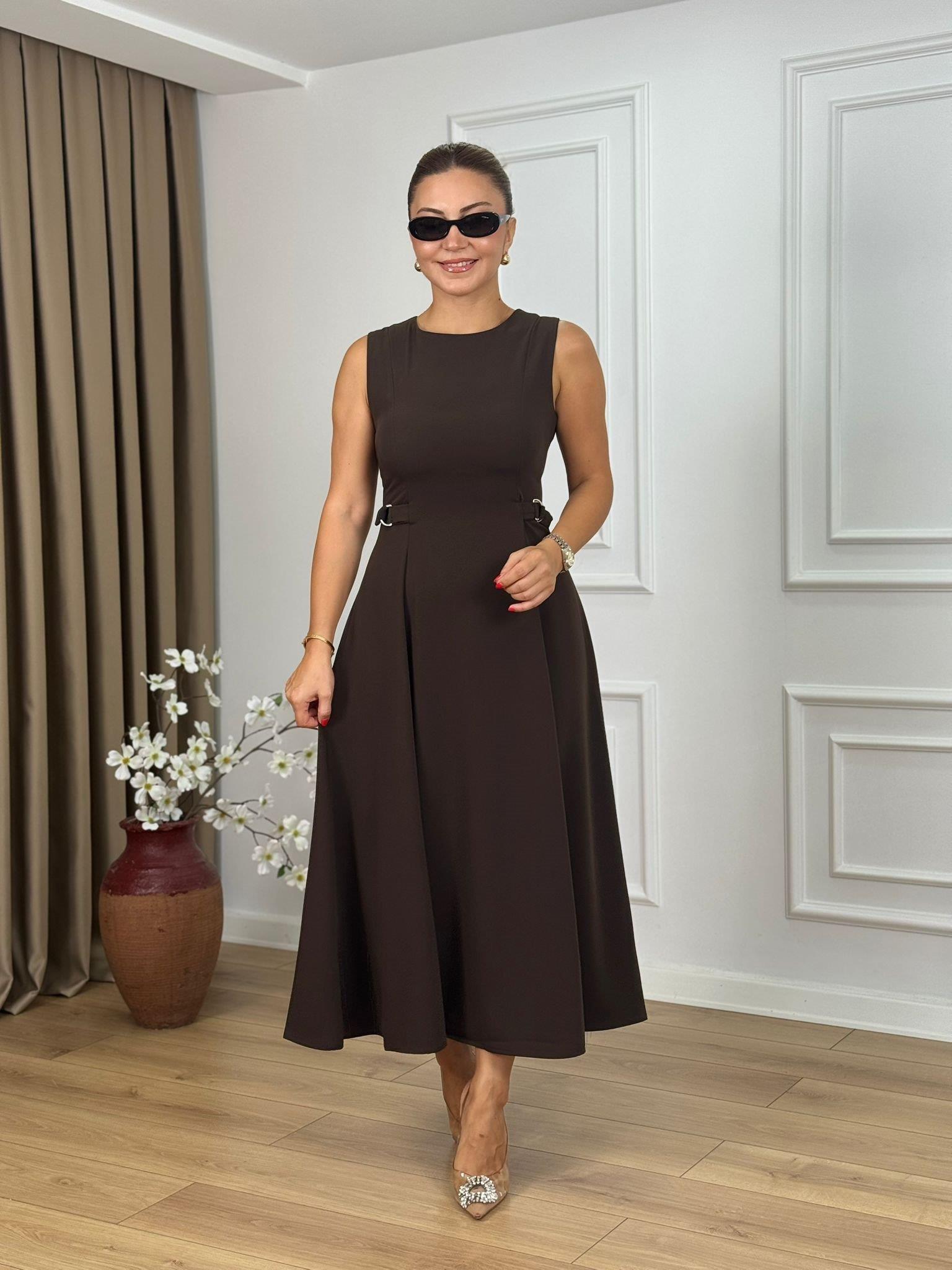 Kahve Bisiklet Yaka Parçalı Kemer Detaylı Krep Kumaş Elbise 2313 (P-00000009060)