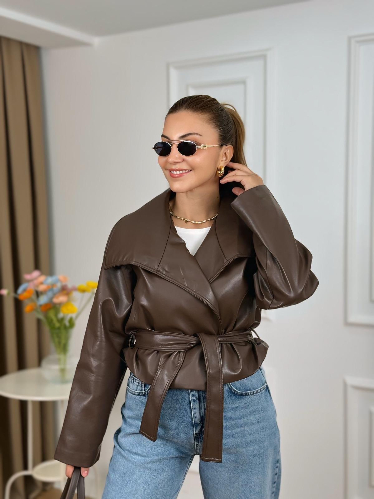 Kahve Tasarım Geniş Yakalı Astarlı Deri Ceket 251010 (P-00000009208)